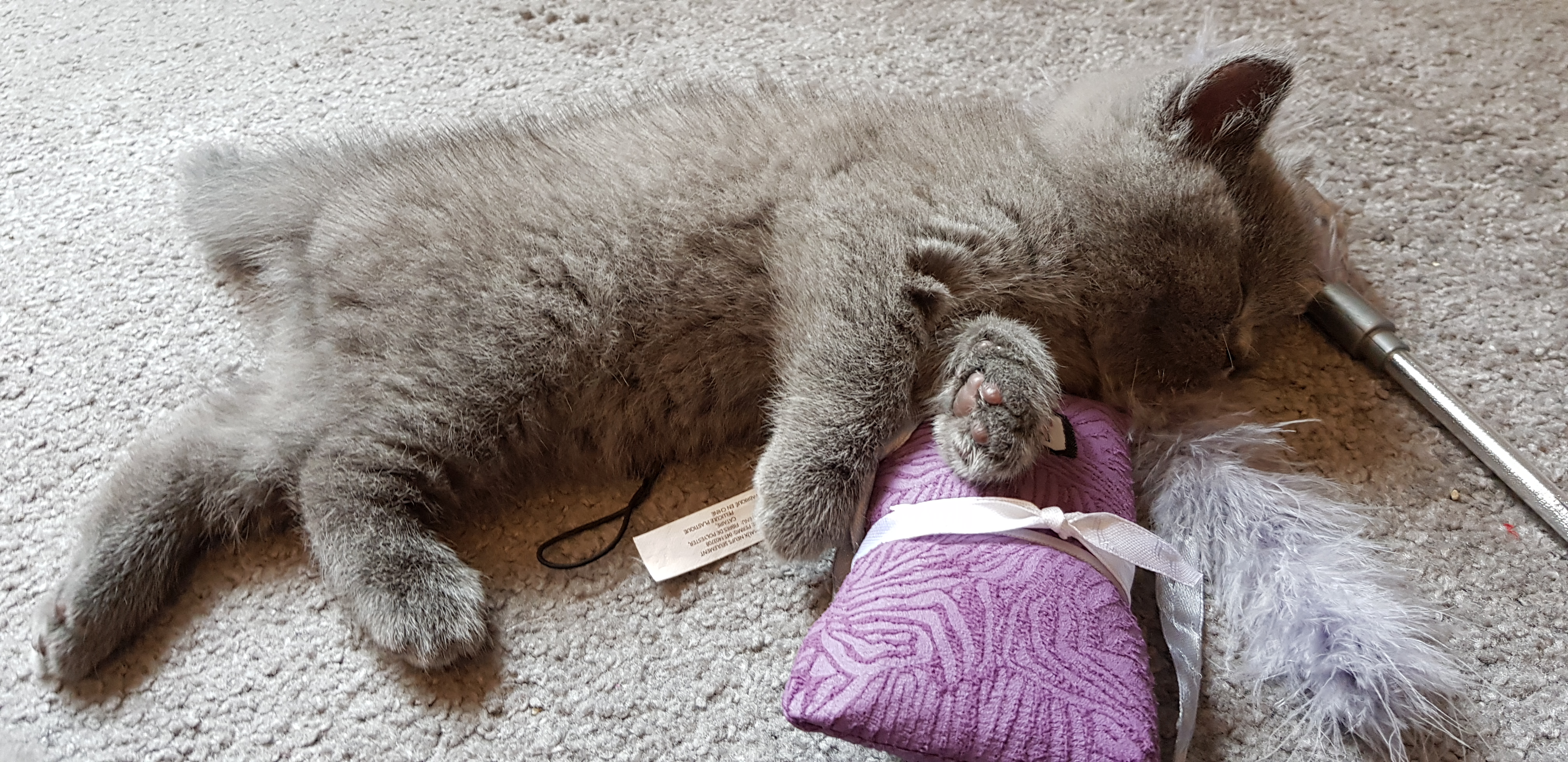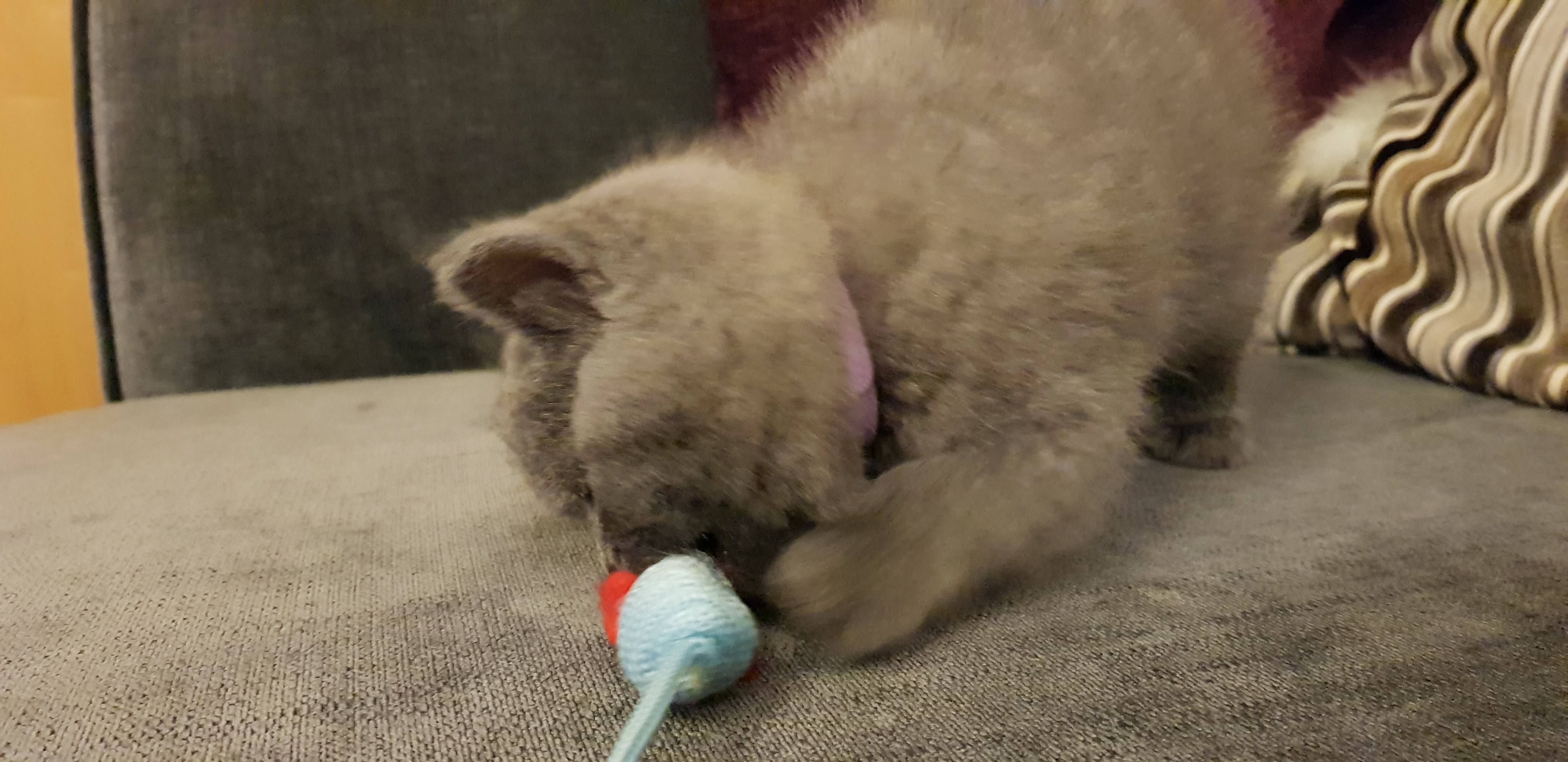 He’s so full of energy and loves to hunt and tackle either his purple toy mouse or the blue one.