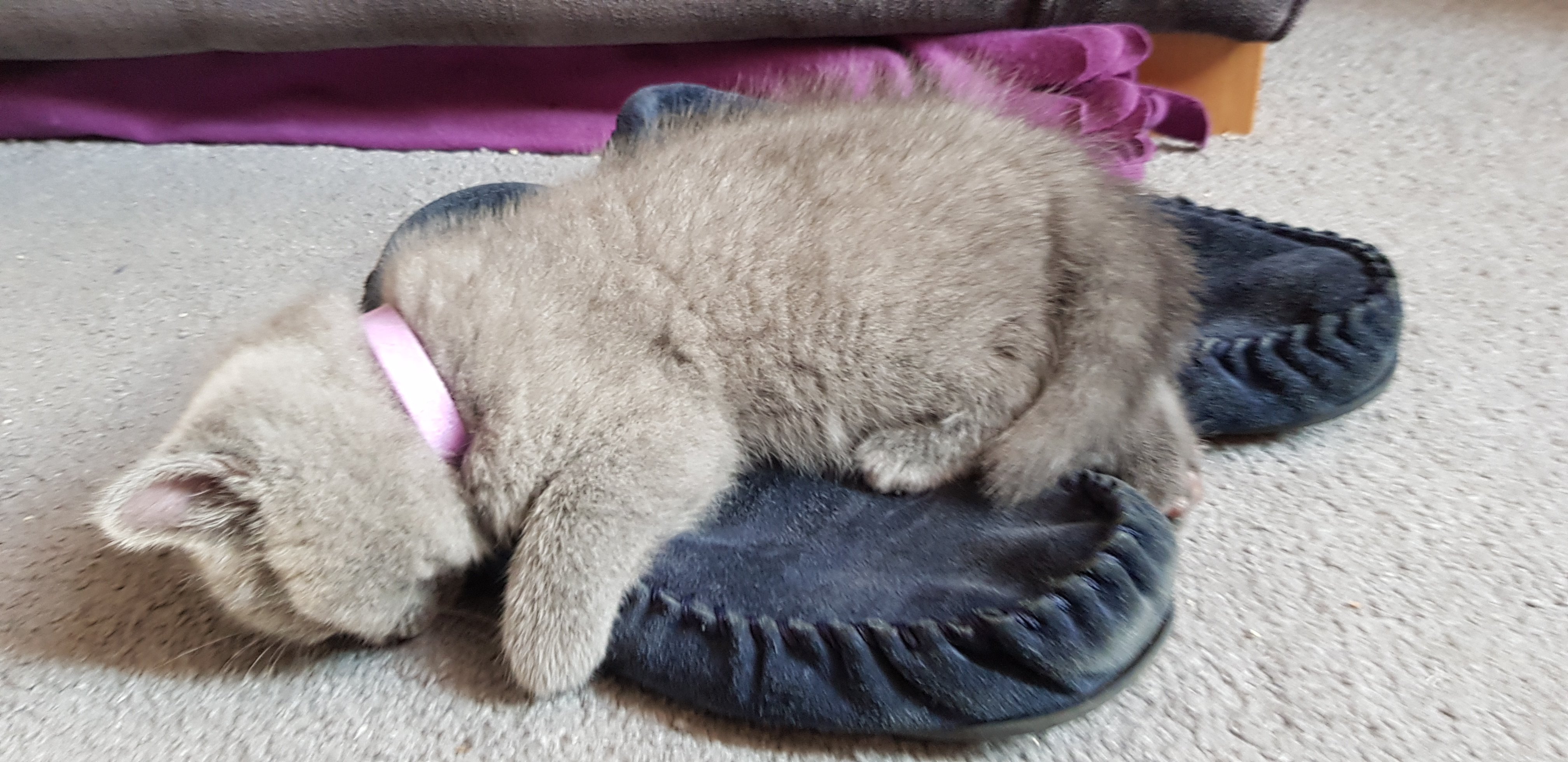 He loves lying in shoes or a suede slipper. He will often curl up by your feet.