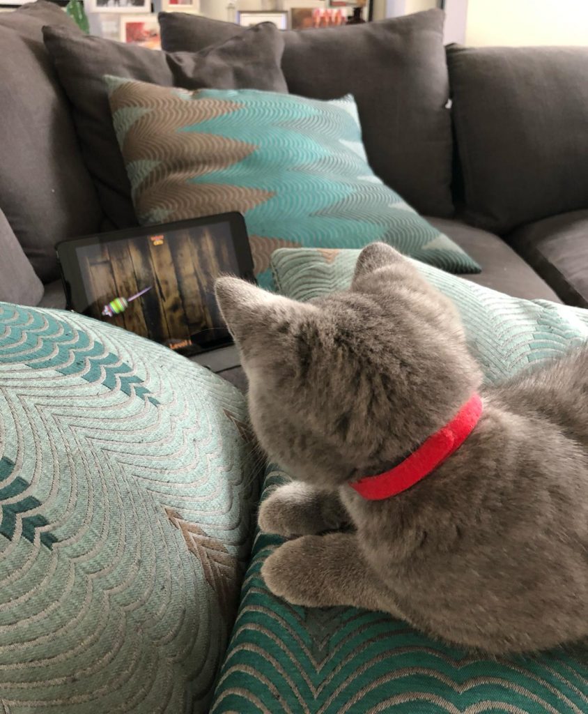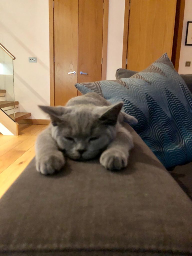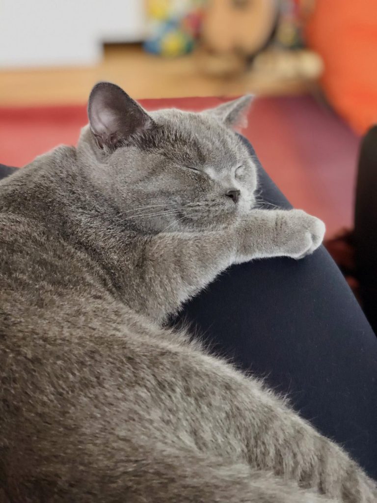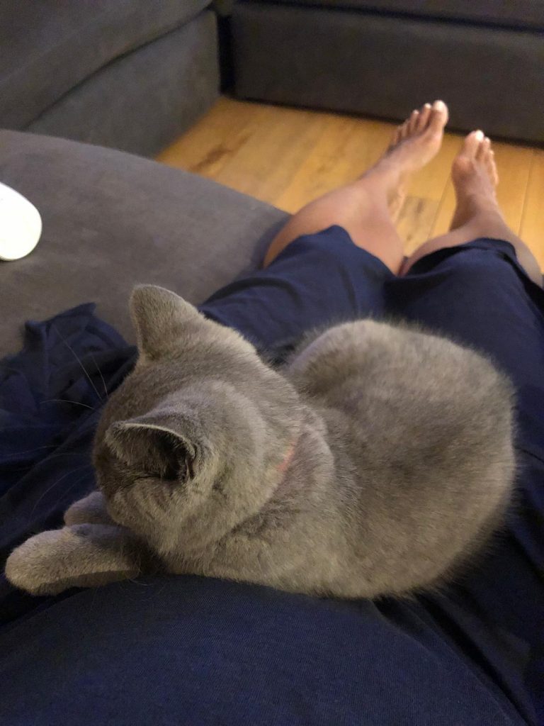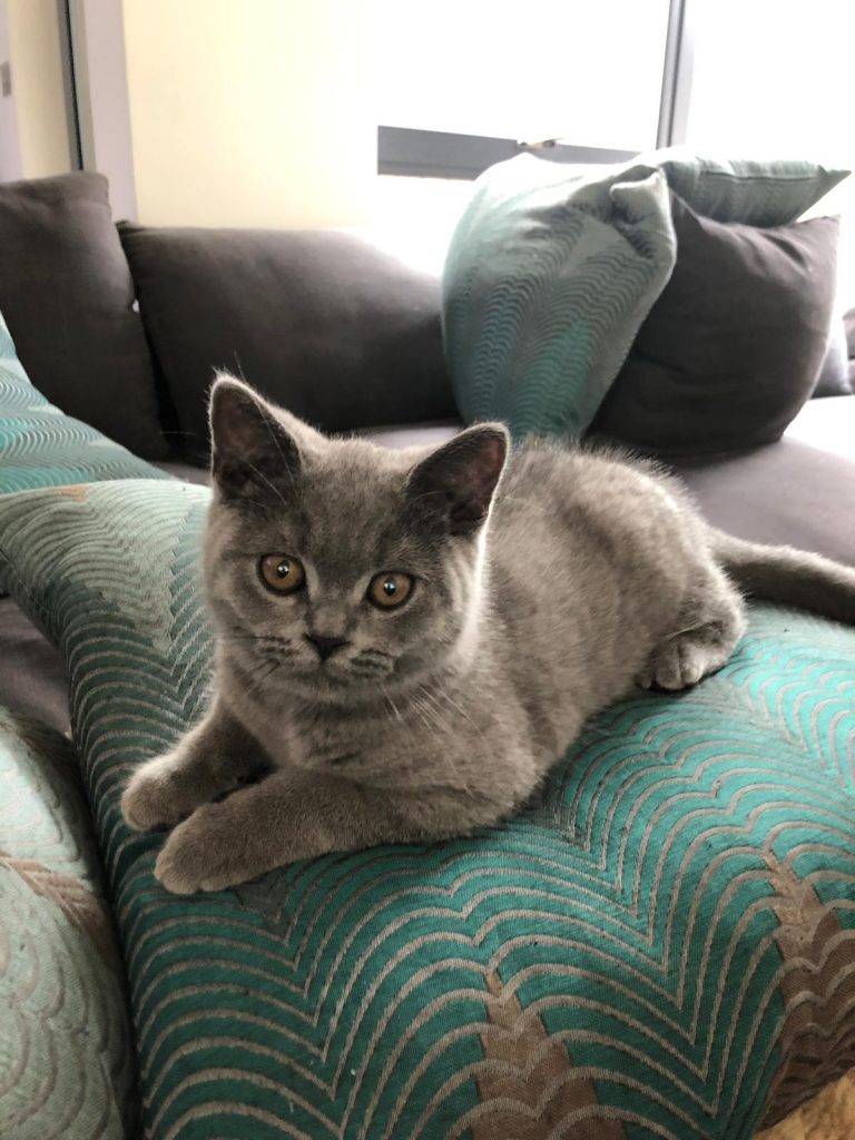 Santi has settled in great. He has a very curious nature and loves getting into cupboards of boxes. It’s great to see him also improving his hunting skills and he’s got a very loud purr!! He still loves sleeping on laps but he’s starting to get bigger now so is starting to prefer sleeping near us. He’s a bit shy around new people but I guess in time he will become more confident. We adore him!